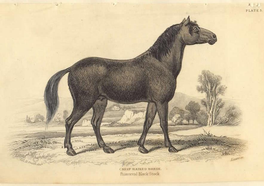 | This picture is of a "CRISP HAIRED HORSE (Primaeval Black Stock)" in The Natural History of Horses by Lieut. Col Chas Hamilton Smith: the equidae or genus equus of authors